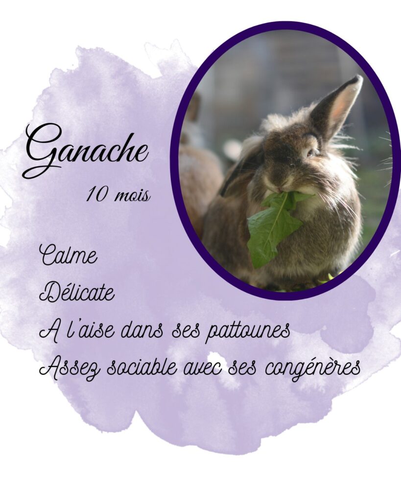 Ganache est une jeune lapine de 10 mois, douce et pleine de sérénité. Calme et bien dans ses pattounes, elle aime explorer son environnement avec assurance et curiosité. Sociable avec ses congénères, Ganache apprécie leur compagnie et partage volontiers des moments de détente à leurs côtés.