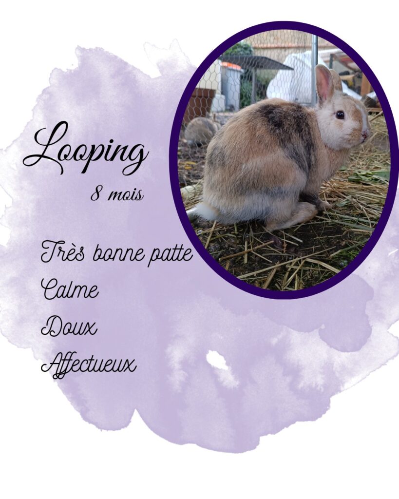 Looping est un jeune lapin de 10 mois, d’une douceur remarquable. Calme et affectueux, il est une bonne patte qui aime les moments de tendresse et la tranquillité. Il est également très gentil avec ses congénères, avec lesquels il entretient des interactions pleines de douceur.