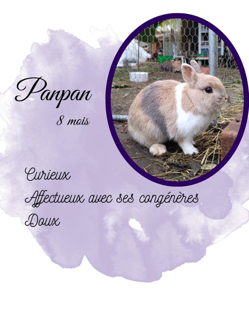 Panpan est un jeune lapin nain de 8 mois, plein de curiosité et de tendresse ! Très sociable et doux, il apprécie la compagnie de ses congénères avec lesquels il se montre affectueux et joueur. Docile avec l’humain, Panpan ne fuit pas le contact et se laisse même approcher pour des gratouilles.
