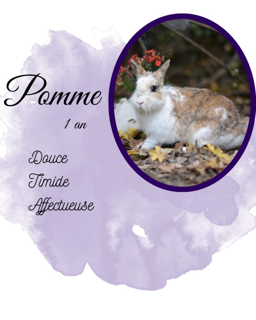Pomme est une douce et jeune lapine d’un an, timide mais déjà curieuse ! Elle a grandement pris confiance au fil de son accueil ces derniers mois et vient maintenant de temps en temps demander des papouilles sur la tête. Sociable avec les lapin.e.s, elle préfère celles et ceux qui comme elles sont d’un caractère plutôt calme. Bien qu’elle ne soit plus craintive comme à son arrivée, on lui recherche une famille qui saura prendre le temps de la laisser venir elle-même si jamais elle était à nouveau un peu en retrait lors d’un changement d’environnement. Pomme peut être adoptée avec l’un des lapinous avec qui elle vit ici, ou bien seule pour rejoindre une famille qui en a déjà.
