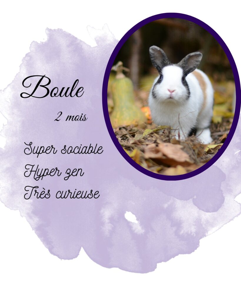 Boule est une adorable petite lapine naine de 2 mois, déjà pleine d’assurance et de curiosité ! Très bien dans ses pattounes, elle adore explorer chaque recoin de son environnement et découvrir de nouvelles choses. D’une douceur incroyable, Boule est aussi très sociable et cherche volontiers le contact, aussi bien avec l’humain qu’avec ses congénères.