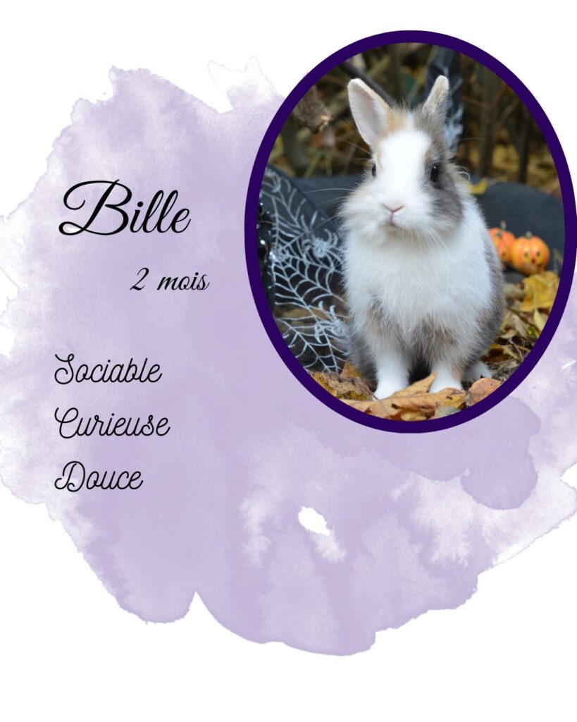 Bille est une petite lapine naine de 2 mois, douce et pleine de tendresse. Calme et affectueuse, elle aime les moments de proximité et de câlins, notamment avec ses congénères. C’est une jeune lapine attachante qui saura rapidement conquérir le cœur de sa future famille humaine et lapine !